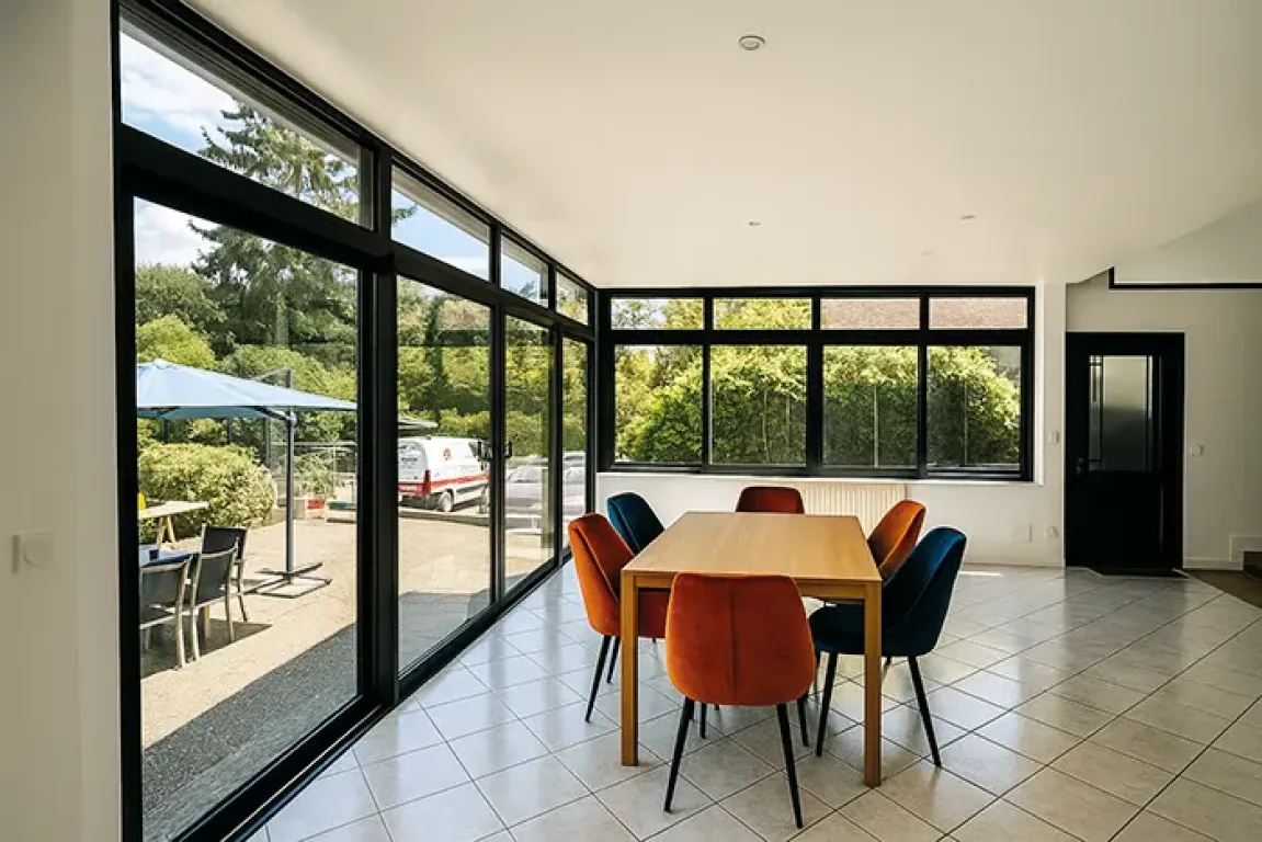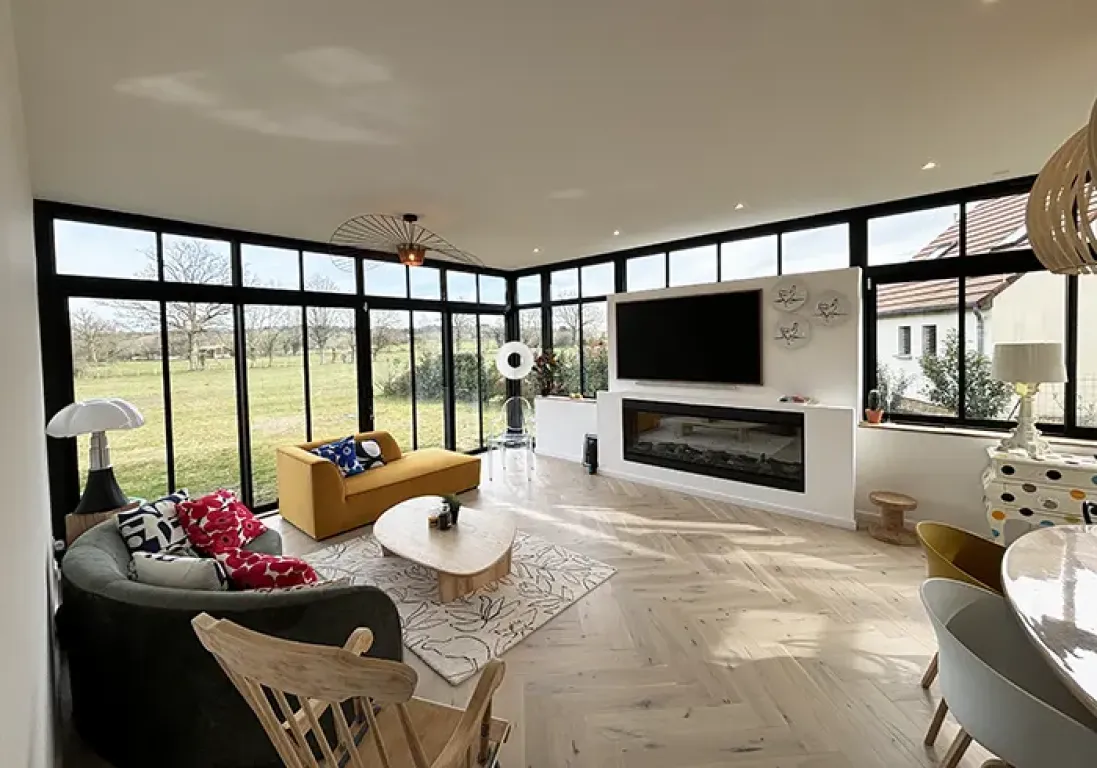 Ce type d’extension repose sur une structure fine et graphique qui laisse entrer un maximum de lumière naturelle. Les grandes baies vitrées et les verrières créent une véritable ouverture sur le jardin et apportent une sensation d’espace particulièrement agréable au quotidien. Le résultat est une pièce lumineuse et chaleureuse qui devient rapidement l’un des lieux de vie préférés de la maison.