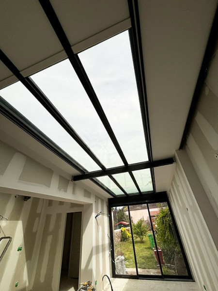 Les baies vitrées et le toit en verre favorisent une luminosité naturelle optimale, créant une continuité harmonieuse entre l’intérieur et l’extérieur. Pour encore plus de confort, l’installation d’un store motorisé permet de réguler la lumière selon les saisons. En été, il protège de la chaleur tout en préservant une atmosphère agréable, tandis qu’en hiver il laisse entrer un maximum de clarté et de chaleur solaire.