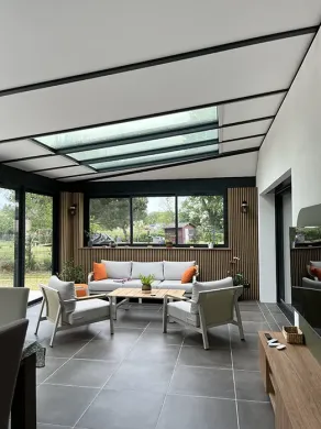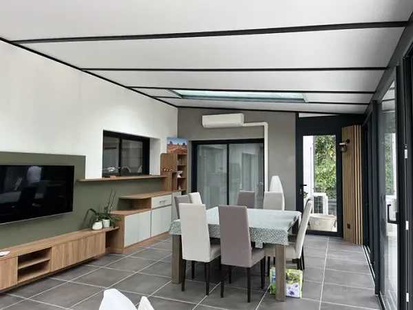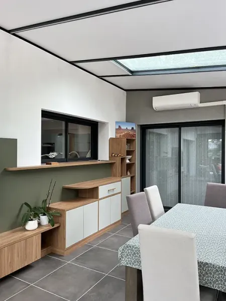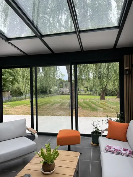 L’isolation est au cœur de la conception d’une véranda performante. Chez Véranda Home, la qualité thermique est une priorité : les matériaux choisis garantissent une température agréable en toute saison. Grâce à des vitrages isolants, des menuiseries en aluminium à rupture de pont thermique et une toiture bien pensée, cette véranda offre le même confort qu’une pièce traditionnelle. Nos clients peuvent ainsi en profiter toute l’année, sans se soucier des variations de température.