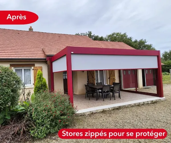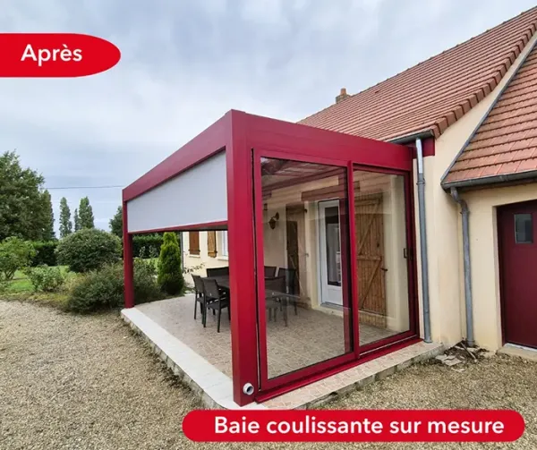 • Lieu de vie protégé des intempéries avec la baie coulissante sur mesure, installée sur le côté le plus exposé au vent et à la pluie