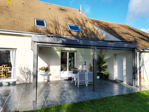 Réalisation sur-mesure d’un préau aluminium par Véranda Home à Ruaudin près du Mans