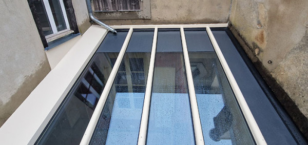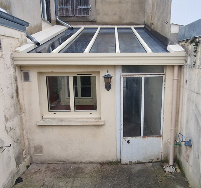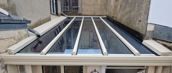 L’ossature en aluminium, choisie dans une élégante teinte crème, s’intègre parfaitement à l’architecture existante. Sa corniche moulurée, travaillée avec soin, apporte une touche de raffinement supplémentaire, soulignant le caractère de la structure tout en la modernisant.