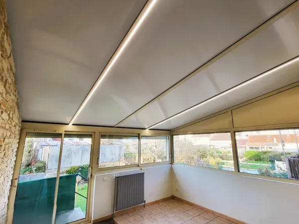 L’intervention a également intégré l’installation d’un éclairage moderne grâce à la mise en place de bandeaux LED. Ces derniers sont équipés d’un variateur d’intensité, permettant d’ajuster l’ambiance lumineuse selon les moments de la journée ou les activités dans la véranda.