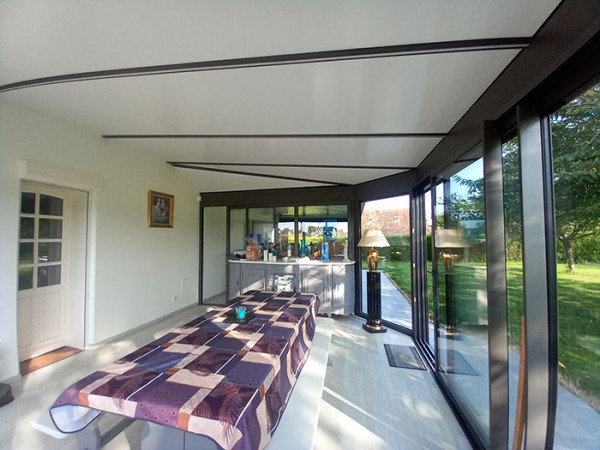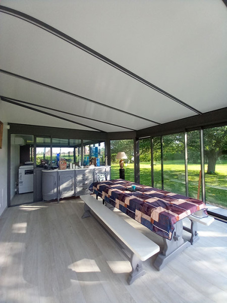 L’ajout d’une corniche moulurée confère à l’ensemble une touche d’élégance classique. Ce détail architectural raffiné sublime l’esthétique de la véranda, lui donnant du caractère et s’intégrant parfaitement au style de l’habitation existante. Cet élément n’est pas seulement décoratif, il participe aussi à l’isolation en dissimulant certains dispositifs techniques pour une finition soignée.