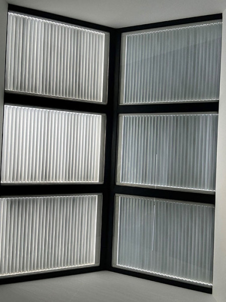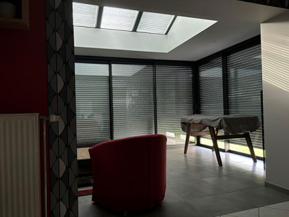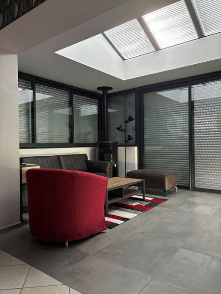 Cette configuration offre plusieurs bénéfices. En journée, elle maximise l’apport solaire, réduisant ainsi le besoin d’éclairage artificiel et contribuant à une meilleure efficacité énergétique. En hiver, les rayons du soleil participent au réchauffement naturel de l’espace, tandis qu’en été, les stores motorisés permettent de contrôler facilement l’ensoleillement et la chaleur. Ce mariage subtil entre luminosité et protection thermique assure un confort optimal, quelle que soit la période de l’année.